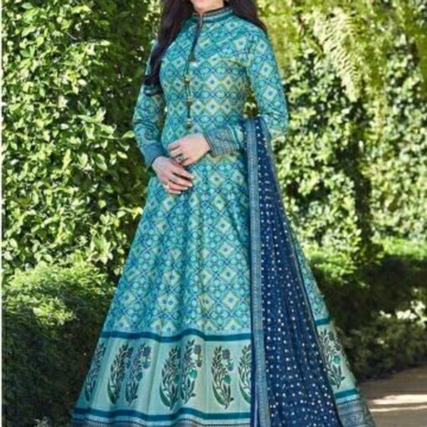 Classy Fabulous Women Gowns Fabric: Banarasi Silk Sleeve Length: Three-Quarter Sleeves Pattern: Self-Design Multipack: 1 Sizes: Free Size (Bust Size: 34 in, Length Size: 46 in, Waist Size: 34 in, Hip Size: 36 in, Shoulder Size: 34 in)